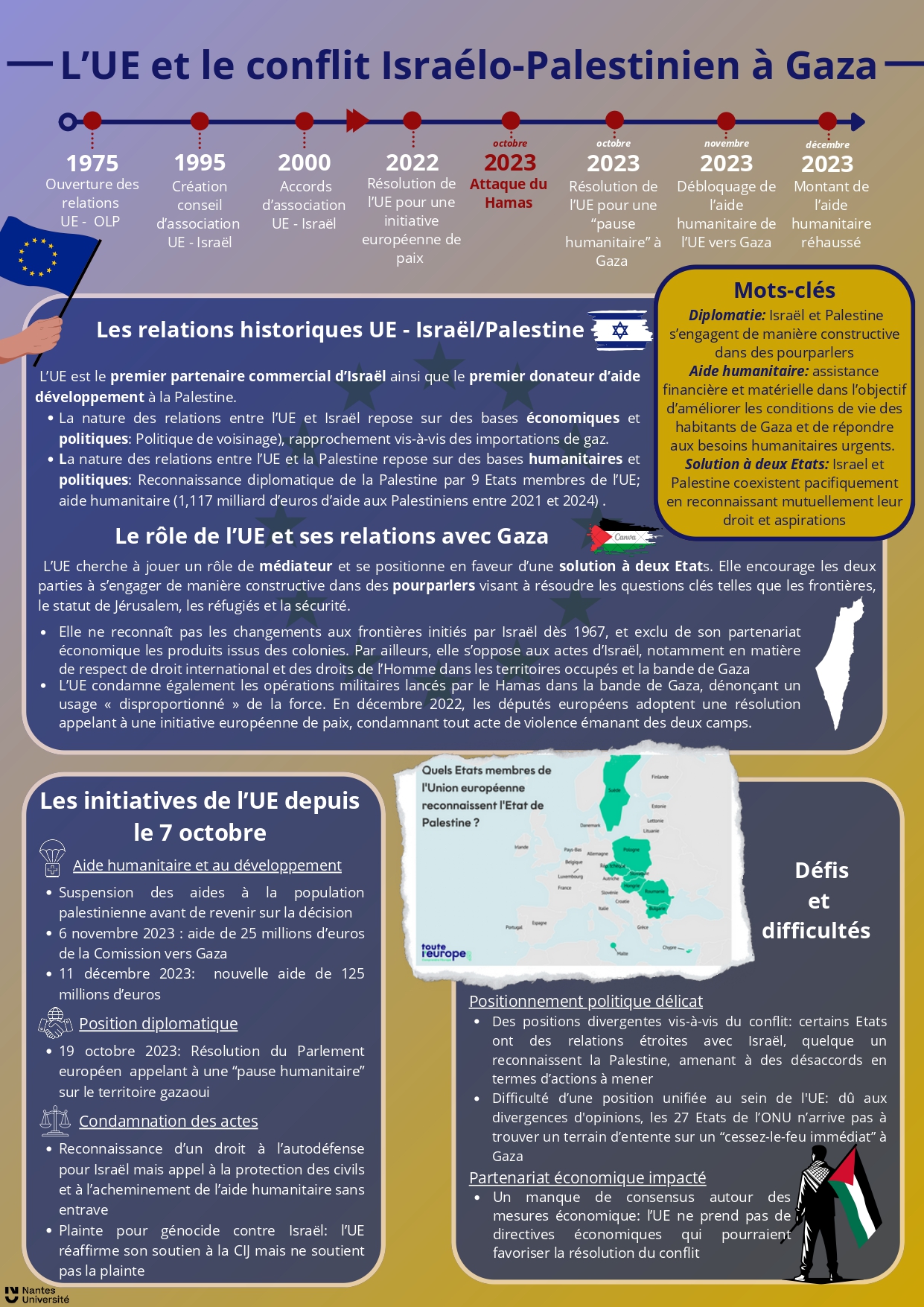 Aujourd’hui, nous vous proposons de vous plonger dans les travaux réalisés, il y a quelques mois, par deux étudiants : un poster et une analyse des dynamiques de l’Union européenne et de ses acteurs étatiques dans le conflit isréalo-palestinien, suite aux attaques du 7 octobre 2023.