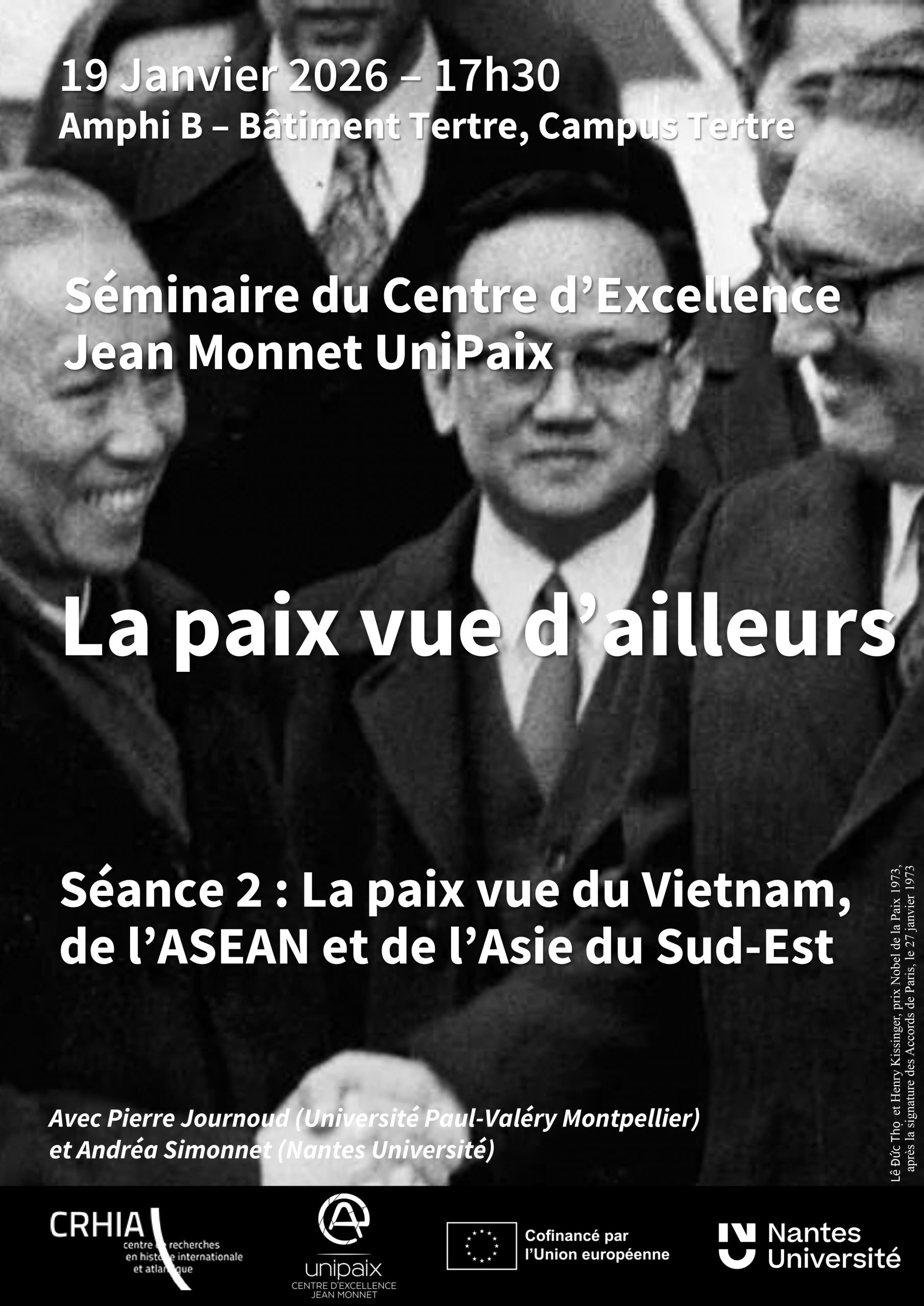 La deuxième séance de ce cycle se déroulera le 19 janvier 2026 de 17h30 à 19h30 dans l’amphi B du bâtiment Tertre, et portera sur La paix vue du Vietnam, de l’ASEAN et de l’Asie du Sud-Est.